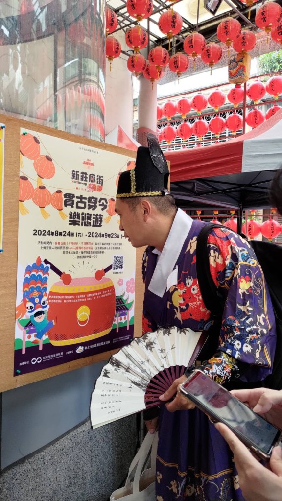 為促進新莊廟街在地活化,吸引人潮進入街區,新莊廟街發展協會8/23-9/23期間舉辦貫古穿今樂悠遊活動,邀請親子家庭與愛好裝扮的大眾一起穿梭古今,體會著古裝遊廟街的樂趣。活動服務處有孩童免費古裝租借,只要穿古裝遊廟街,在遊逛中與商圈內任一景點合照並公開分享在自己的社群,就可出示社群畫面在活動服務處抽取商圈小禮物。